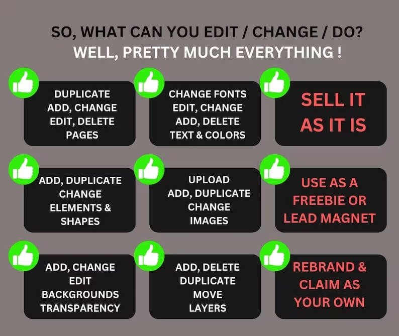 • Customization: Easily adjust the content, design, and branding to make it your own. Insert your logo, use your brand colors, and create a personalized product.